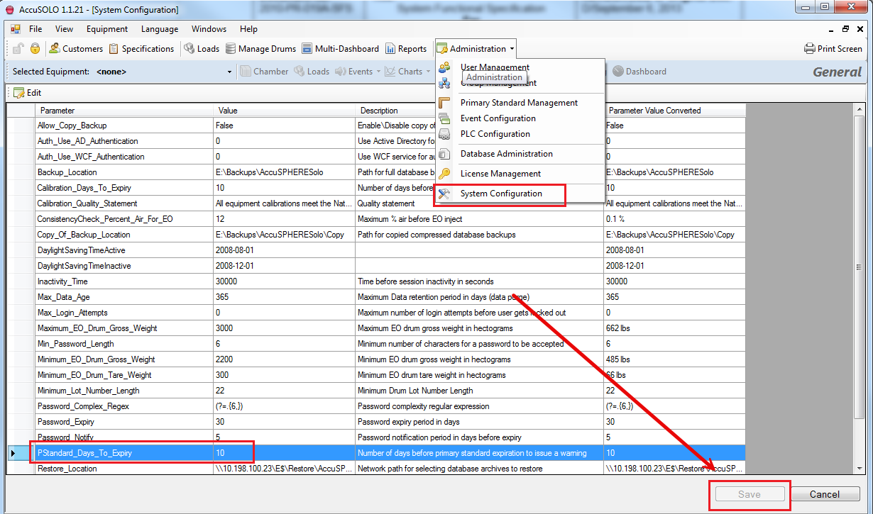 Select the System Configuration menu from the Administration drop-down, set the number of days before primary standard expiration to issue a warning, and click Save.