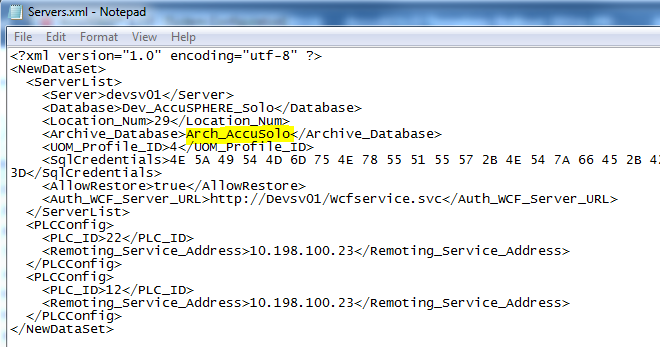 Note: In order for the restore function to work correctly, an archive instance of the database must exist with the same name as is defined in the servers.xml file for the client application. For example, if you name the archive database “Arch_AccuSOLO” in the servers.xml file, then the archive database must also be called Arch_AccuSOLO.